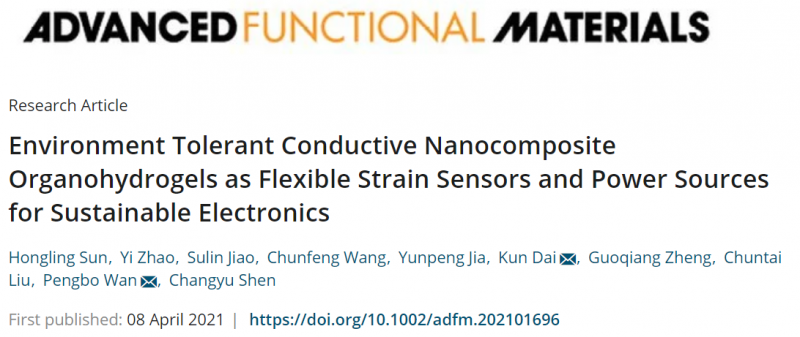 nductive Nanocomposite Organohydrogels as Flexible Strain Sensors and Power Sources for Sustainable Electronics”为题发表在材料领域顶级期刊《Advanced Functio