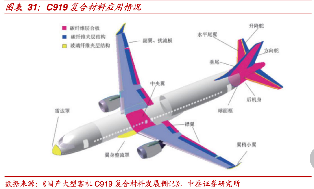 在第十四届珠海航展上,国银金租、工银金租、建信金租、交银金租、招银金租、浦银租赁和苏银金租七家租赁公司与中国商飞公司签署 300 架 C919 飞机确认订单。C919 中复合材料用量占比约12%,主要分布于水平尾翼、垂直尾翼、翼梢小翼、后机身等部件。CR929中复合材料用量占比预计超过 50%,并将应用于机身、机翼等主承力构件。