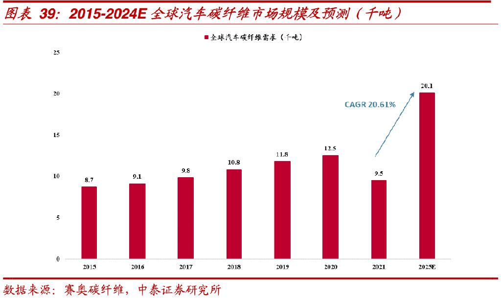 与传统车用金属相比,碳纤维复合材料的密度低、强度高、耐腐蚀性及可设计性强,是最有发展前景的汽车轻量化材料。2021 年全球车用碳纤维市场规模为 9500 吨,随着中高端汽车市场的扩张、汽车轻量化的推进,叠加碳纤维技术水平与生产工艺的不断成熟,车用碳纤维市场有望加速发展,根据赛奥碳纤维,2021-2025 年 CAGR 为 20.61%,2025 年将达 2.01 万吨。