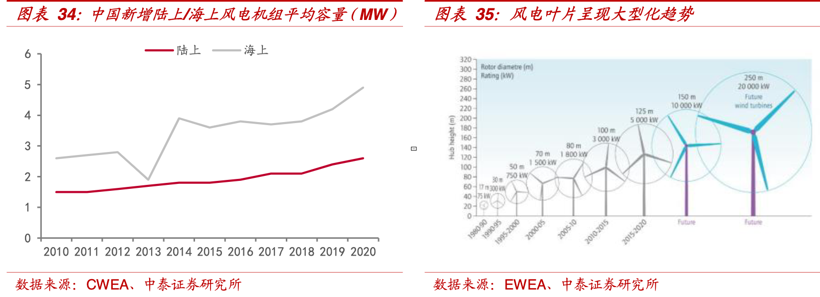 根据CWEA数据 , 2020年全国新增陆上/海上风电机组平均功率为2.6/4.9MW,较 2019 年 2.4/4.2MW 继续提升。为匹配风电机组的大型化,风电叶片也呈现大型化的趋势。