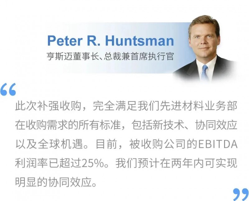 CVC热固性特种材料公司年收益约为1.15亿美元,目前拥有两座工厂,分别位于俄亥俄州的阿克伦市和新泽西州的梅普尔谢德市。根据协议条款,亨斯迈将支付3亿美元的收购款,但需根据营运资本及其他因素作出后调整。此次交易为全现金交易,资金来源为公司可动用流动资产。收购价相当于2019年全年调整后EBITDA(息税摊销前利润)的约10倍,或协同效应预估值的7至8倍,实现协同收益下限值取决于稳定增长的市场条件。预计交易将于2020年年中完成。