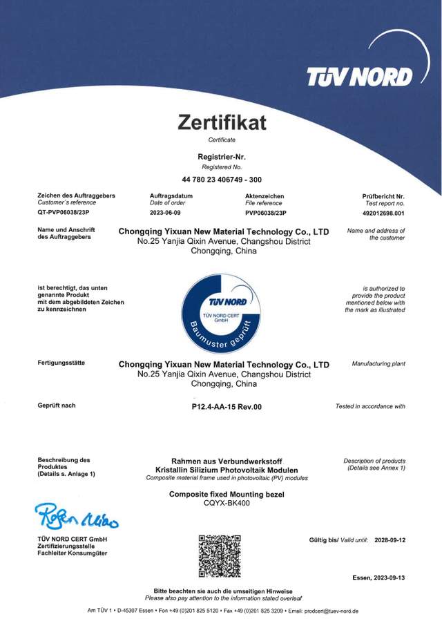 重庆亿煊是重庆国际复合材料股份有限公司(国际复材)的全资子公司,致力于为光伏行业和全球客户提供高性能、高效率的产品和系统解决方案。TÜV北德针对重庆亿煊的光伏组件用复合材料边框进行了材料力学性能测试、基材物理性能测试、阻燃等级测试以及耐热性能等测试,整个测试周期中该材料表现良好,最终通过TÜV北德检测。