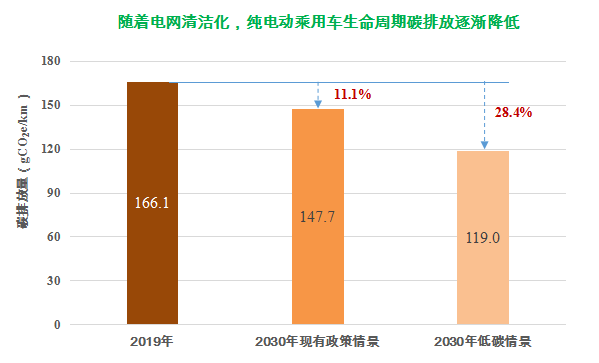 2.电网清洁化情景下2030年现有政策情景和低碳情景中纯电动乘用车生命周期碳排放分别为147.7gCO₂e/km和119.0gCO₂e/km,分别比2019年降低了11.1%和28.4%,低碳情景比现有政策情景可实现19.4%的碳排放降低。
