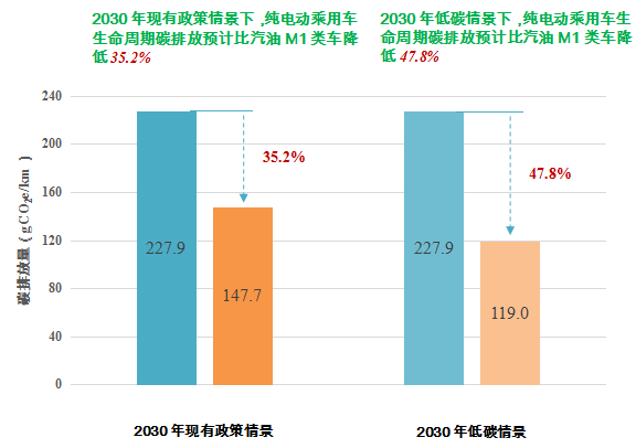 3.相对于汽油M1类车,2030年现有政策情景和低碳情景中纯电动乘用车生命周期碳减排潜力分别可以达到35.2%和47.8%,低碳情景中纯电动乘用车生命周期碳减排潜力将比现有政策情景增加12.6%。