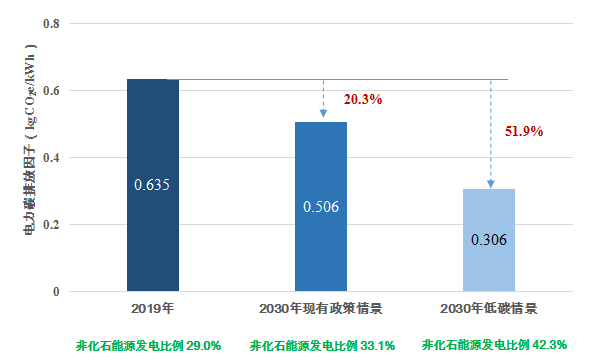 备注:2030年非化石能源发电比例和电力碳排放因子数据来源于International Energy Agency. Global EV Outlook 2019.