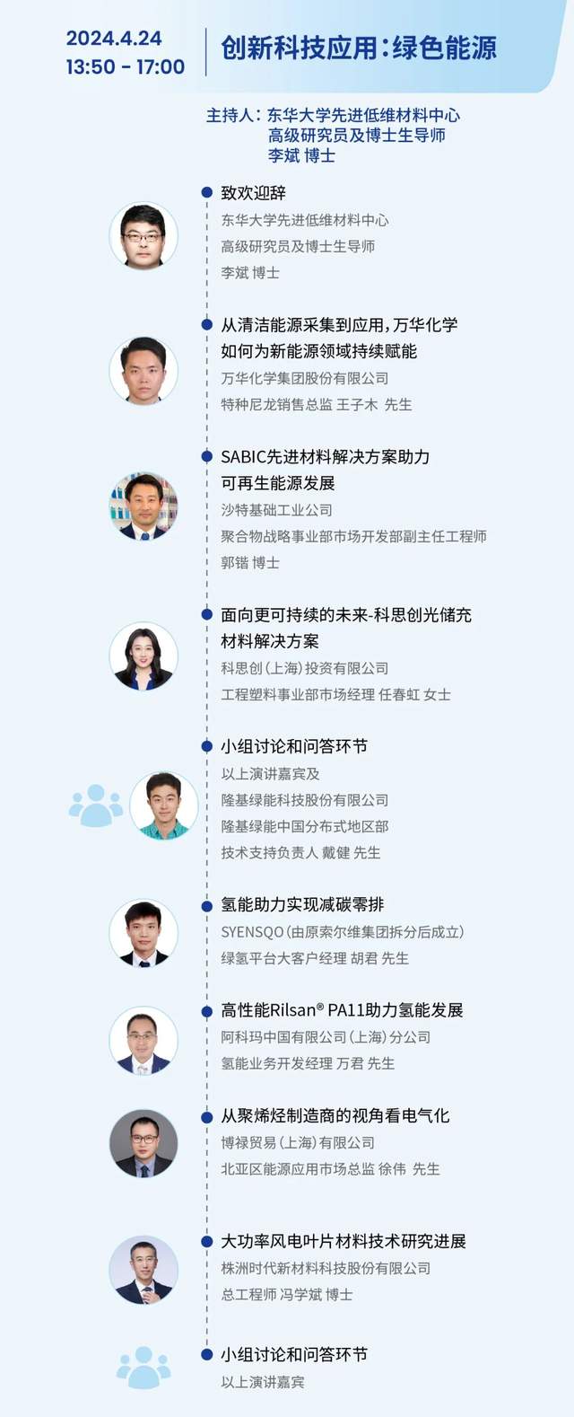 用于新能源汽车的有机硅特种弹性体,应用于固态电池包的轻量化、高效热管理、可循环回收的材料,应用于高压连接器的无卤阻燃增强PA66,助力光伏胶膜创新的POE、硅烷接枝烯烃共聚物、光稳定剂,提高光伏组件发电效能的ETFE薄膜,太阳能自动模头,医用级PLA、PEEK 3D耗材挤出设备,可降解植入骨钉注塑成型技术,应用于包装的定制回收解决方案,PHA多产品专用改性料,应用于航天、航空及轨道交通的高强度和高刚度材料等。