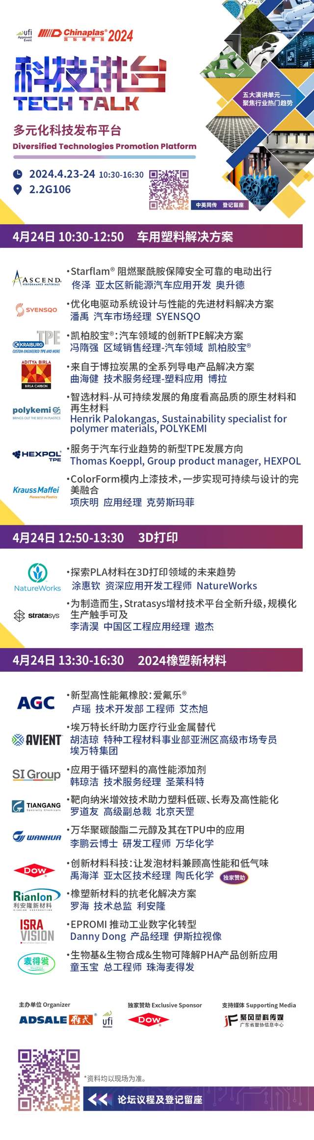 震撼发布超过30+项创新科技,覆盖五大主题:先进包装解决方案、环保方案、车用塑料解决方案、3D打印及2024橡塑新材料。