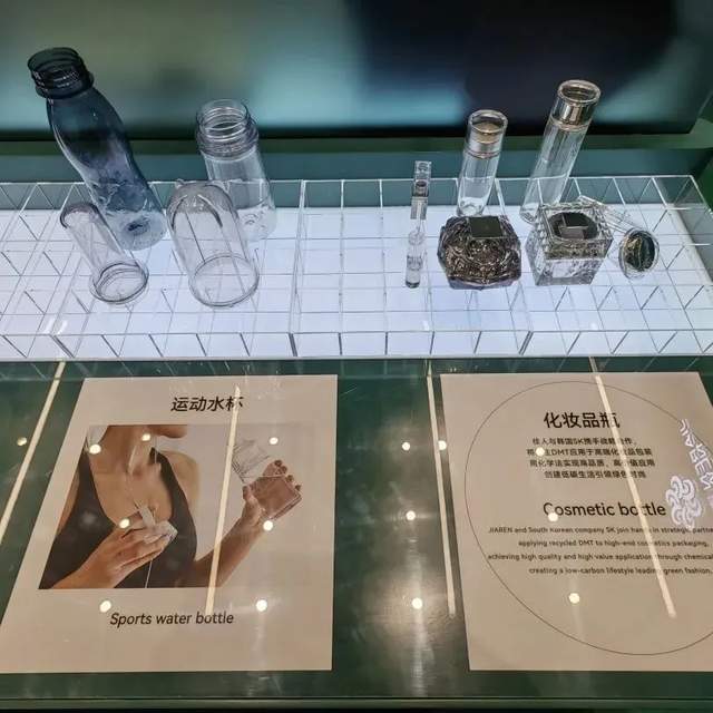 ▲浙江佳人新材料展示了化学法分子级循环再生技术,该技术实现废旧聚酯更高品质、更高性能、更高价值的应用。