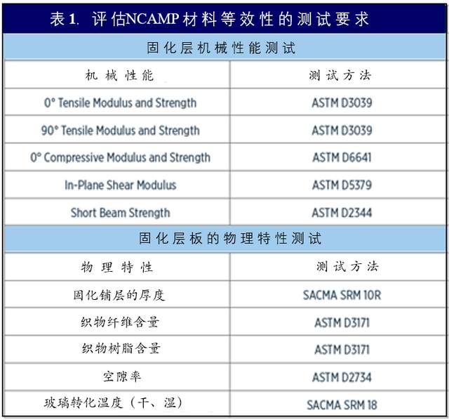 材料等效性测试的目的是执行有限测试并评估选定的材料特性,以证明零件制造商创建的层压板将具有与用于结构分析的材料特性数据集相同的特性。根据其检测纤维和基体材料、预浸料制造工艺、铺层方法和固化工艺变化的能力,选择了用于评估材料等效性的材料性能。表1列出了NCAMP用于证明材料等效性的材料特性和相关试验方法。参考文献2和3中提供了有关NCAMP等效性测试过程的附加信息。