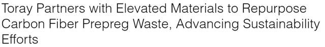 根据这份为期三年的协议,Elevated Materials将对东丽的预浸料废料进行再利用,包括切边废料和全幅预浸料片材。Elevated Materials目标是消除航空航天业中的碳纤维废料。自成立以来,该公司通过其创新的升级再造工艺已成功转移了20万磅(约90吨)的碳纤维废料。Elevated Materials 将这些废料转化为压固化碳纤维板材、板材和块材,可应用于从体育器材到制造配件和无人机等各个行业。