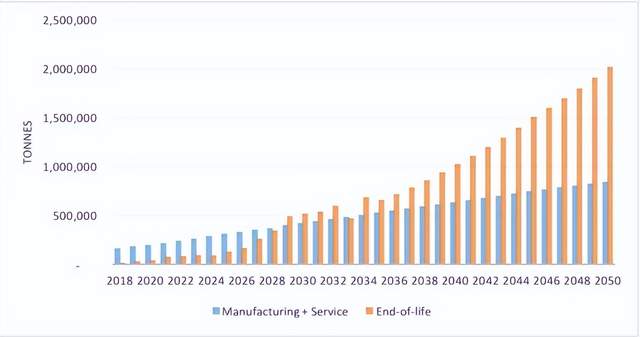 碳纤维回收之所以重要,其大量废弃物累积是重要原因。据英国ELG碳纤维公司所述,在制造过程中,材料往往是手工堆放的,碳纤维片实际尺寸的近三分之一在修剪后未被使用。因此,大量的碳纤维最终没有成为产品,而是被送往垃圾填埋场。每年大约有62000吨未利用的碳纤维废弃物被累积起来,其中飞机和风能行业的废料最多。据推测,到2035年,预计飞机行业将产生23600吨未使用的碳纤维废料,风力涡轮机行业将产生另外48.3万吨。这两个领域产生的碳纤维废料的总和让各国都非常头疼。