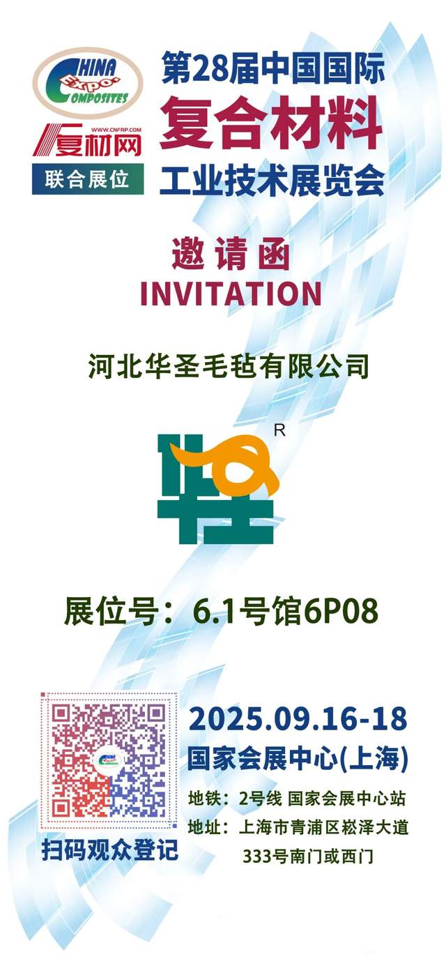 作为亚太地区规模最大、影响力最广的复合材料专业展会,2025 中国国际复材展将于 9 月 16 - 18 日盛大启幕,汇聚全球产业链顶尖企业与前沿技术。河北华圣毛毡有限公司【展位号:6P08】以 "专精特新" 实力诠释传统毛毡材料在复合材料领域的多元应用价值。