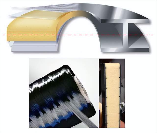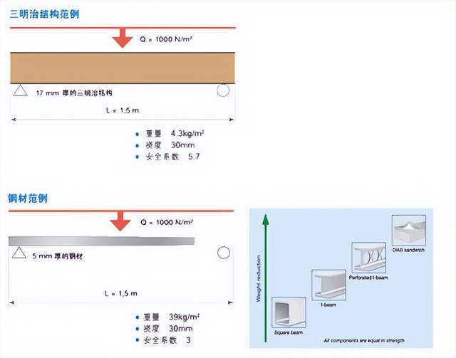 图2在受力相同情况下,碳纤维三明治结构对比传统钢材减重大于70%
