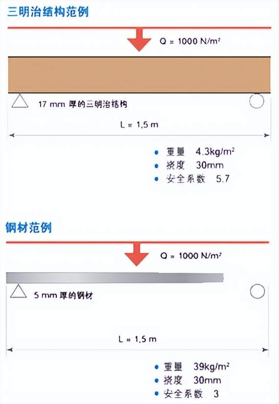 ▲在受力相同情况下,碳纤维三明治结构对比传统钢材减重大于70%